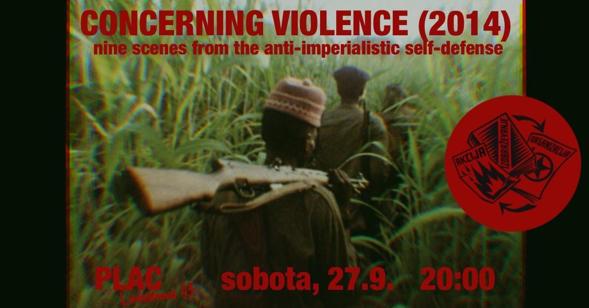 „Concerning Violence“ je antikolonialni dokumentarni film, ki razkriva neolepšano resnico o afriških osvobodilnih bojih proti naseljenskemu kolonializmu, kraji zemlje, izkoriščanju virov in vsiljevanju arbitrarnih meja. Film, ki temelji na revolucionarnem eseju Frantza Fanona, z militantno jasnostjo govori o nujnosti nasilnega upora proti kolonialni in imperialni dominaciji. Film razkriva brutalno realnost, skrito pod olepšano imperialno pripovedjo – etnično čiščenje, državljanske vojne in verske delitve, ki so bili ustvarjeni za ohranitev zahodne nadvlade.