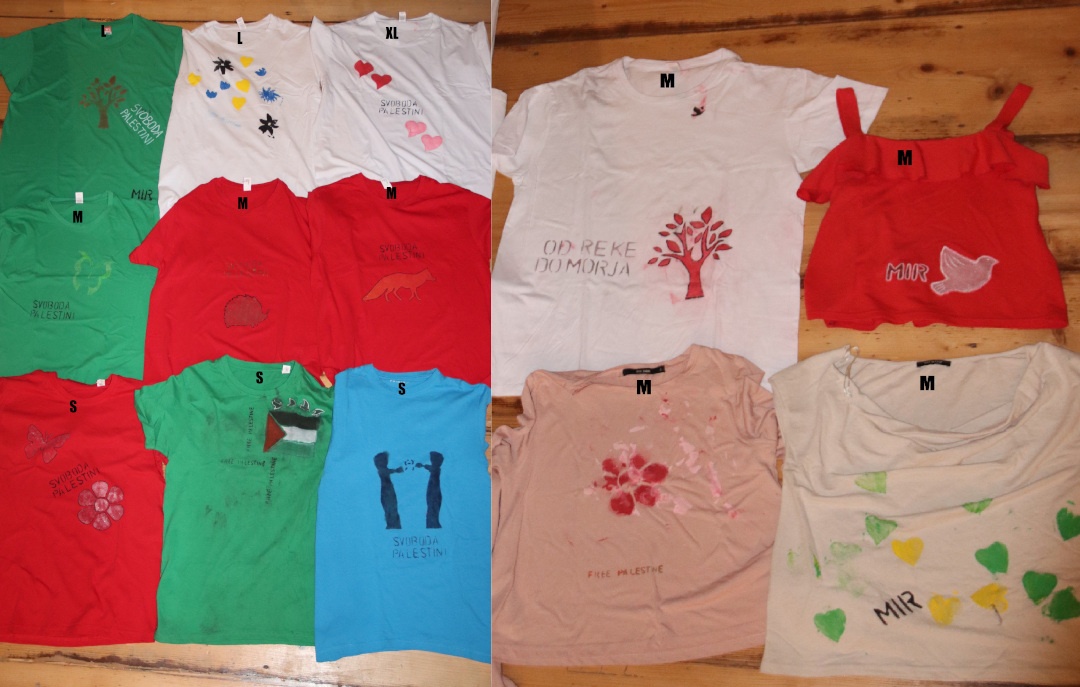 Julija smo veliki in mali otroci na delavnicah z naslovom Niti za svobodno Palestino ustvarjali s potiski na tekstil. Ostalo je še nekaj izdelkov. Izberite svojo najljubšo majico za prostovljne prispevke za družine v Gazi.