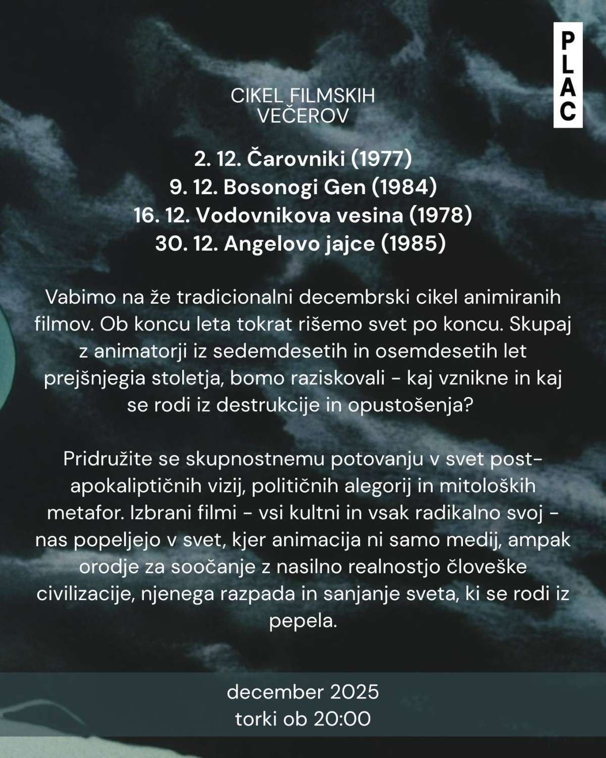 Pridružite se skupnostnemu potovanju v svet post-apokaliptičnih vizij, političnih alegorij in mitoloških metafor. Izbrani filmi – vsi kultni in vsak radikalno svoj – nas popeljejo v svet, kjer animacija ni samo medij, ampak orodje za soočanje z nasilno realnostjo človeške civilizacije, njenega razpada in sanjanje sveta, ki se rodi iz pepela.