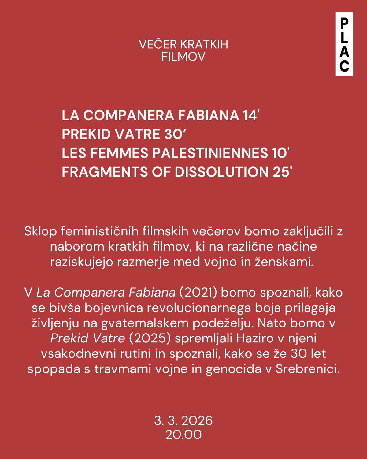 V La Companera Fabiana (2021, 14 min) bomo spoznali, kako se bivša bojevnica revolucionarnega boja prilagaja življenju na gvatemalskem podeželju. Nato bomo v Prekid Vatre (2025, 30 min) spremljali Haziro v njeni vsakodnevni rutini in spoznali, kako se že 30 let spopada s travmami vojne in genocida v Srebrenici.